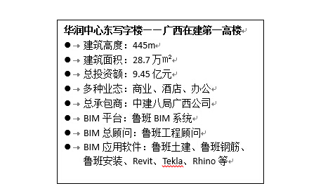 如果将南宁华润中心比作是航空母舰,那么,南宁华润中心东写字楼(以下简称“华润东”)就是航空母舰上的舰岛桅杆,其以445米的北部湾第一高度直指苍穹,划破天际,将南宁带入一个全新的发展阶段。华润东总建筑面积28.7万平方米,建筑高度445米,其中地下3层,地上90层,是一栋钢管混凝土框架与钢筋混凝土核心筒组成的框架核心筒超高层建筑。2016年3月,中建八局广西公司引入鲁班软件BIM系统平台,以华润东项目为首个BIM实施试点项目。