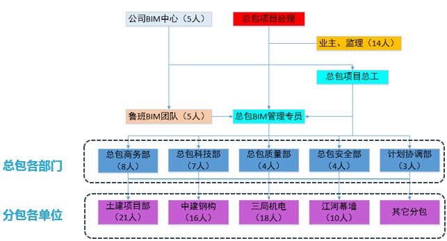 建立BIM总承包管理应用组织架构,把业主、监理、专业分包纳入BIM体系。以往的BIM应用,单纯以总承包或某个专业分包单位来开展,达不到协调管理的效果。