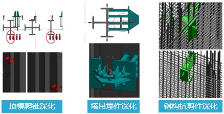 1)深化设计。在深化设计阶段,利用BIM模型,提前解决不同专业构件之间的相互碰撞问题。直观形象的三维模型,帮助项目技术人员解决了在伸臂桁架层顶模爬锥、塔吊埋件、钢结构、钢筋之间的冲突等难题。