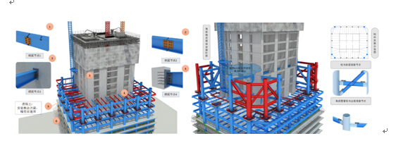 3)方案模拟。利用BIM方案模拟建造工序流程,形成更高效的流水作业,验证方案可行性和优化施工方案。顶模安装模拟:顶模共5层,内顶模9个筒加26片外爬模,顶模安装模拟解决20043个构件拼装吊装顺序的问题,使得一个月内完成了顶模的安装。塔吊支撑架安装模拟:解决了预埋件,C型梁、主梁、水平斜撑、竖向斜撑、水平连杆、连接耳板、销轴、螺栓等构件的安装顺序,保证焊接质量。