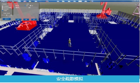 2)安全疏散模拟。超高层安全疏散是超高层安全管理的一项重要的应急内容。顶模上安全疏散模拟最佳逃生路线,保证在60秒内人员从顶模平台撤离至安全区域。并以此跟工人做安全交底。