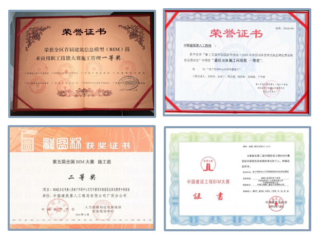 BIM技术在该项目上的应用,不仅仅带来了项目直接经济效益的节约,更是为八局在BIM应用领域的知名度再添一笔,本项目先后获得第十五届中国住博会最佳BIM施工一等奖、中国建设工程BIM大赛卓越工程项目二等奖、中国图学会BIM大赛施工组二等奖、广西地区BIM技术职工技能大赛二等奖等众多奖项。